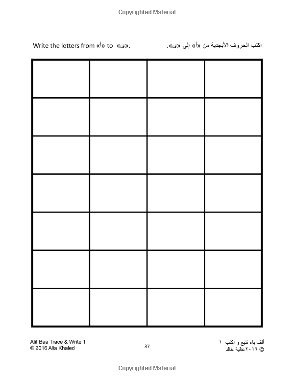 Alif Baa Trace & Write 1: Learn How to Write the Arabic Alphabet (Volume 1) (Arabic Edition) (Arabic) 1st Edition [Author: Alia Khaled]: This book is for children aged 3-7 years. Children can learn to write each letter by tracing the letter of the alphabet. After writing, you can color each letter and learn Arabic in a fun way.