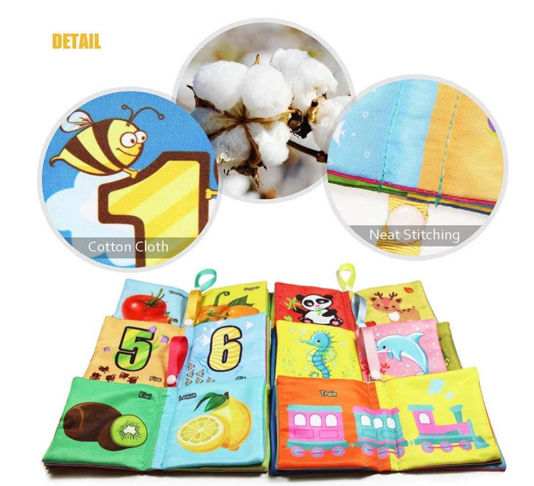 The cloth book has attractive and interesting features on every page. The bright colors and pictures will hold your baby’s attention.