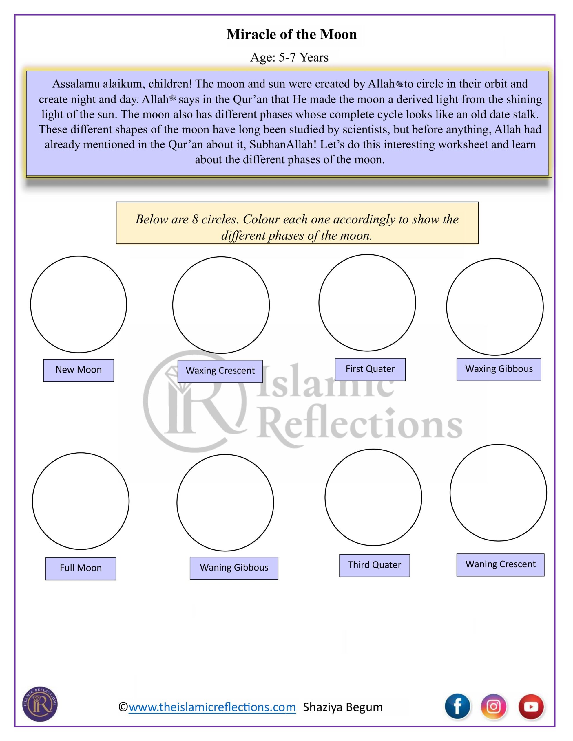 Assalamualikum Kids! Allah, The Almighty created the moon as a derived light from the sun. The moon circles around the sun and each day forms different shapes. Let us learn about this miracle of Allah by doing this interesting worksheet.